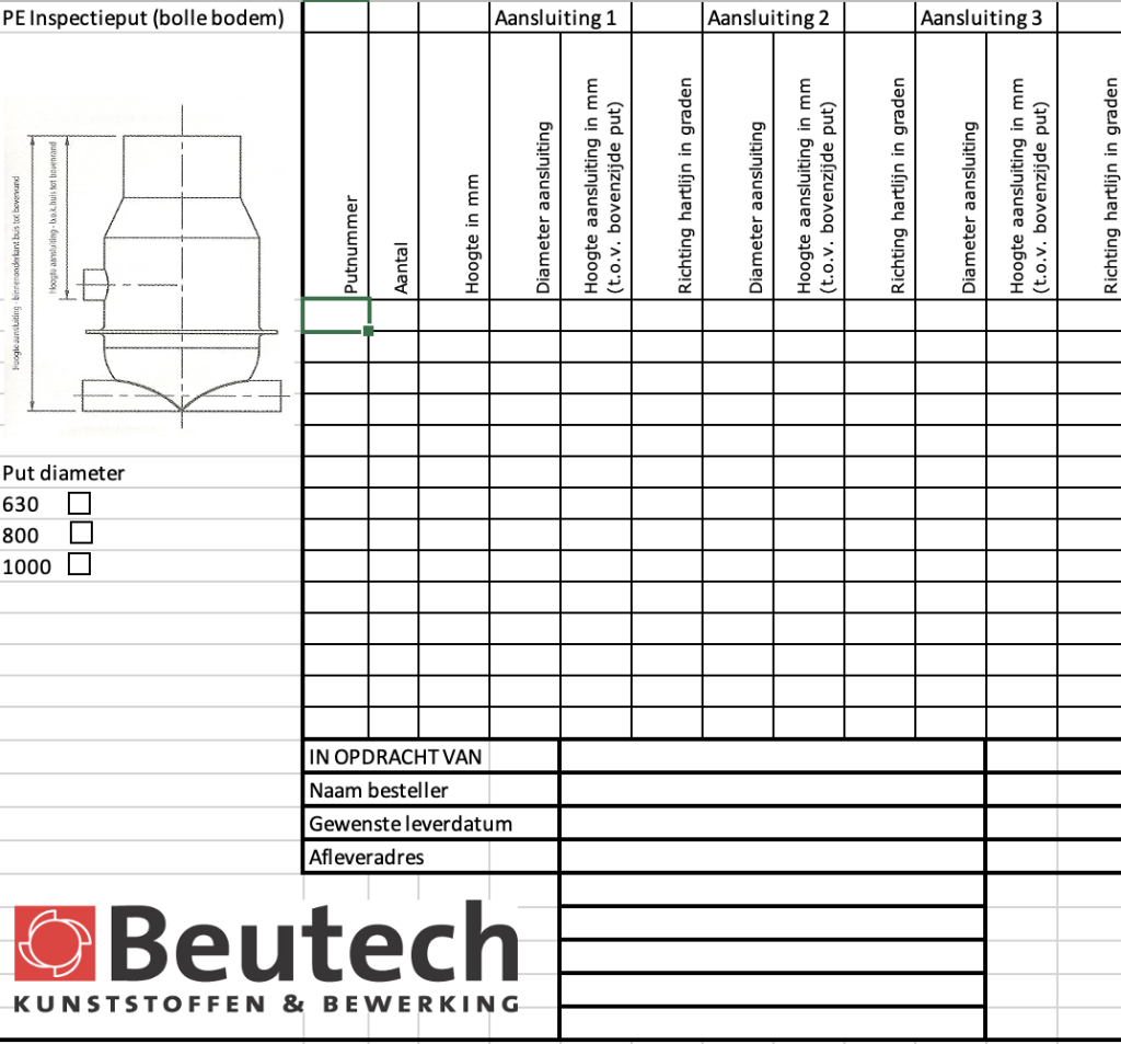 Wil je een bolle bodemput bestellen? Dan gebruik je de onderstaande puttenstaat. Daarmee geef je eenvoudig aan welk type je nodig hebt, inclusief afmetingen, aansluitingen en eventuele opties. Zo zorgen we samen dat je precies krijgt wat je nodig hebt, zonder gedoe of misverstanden.